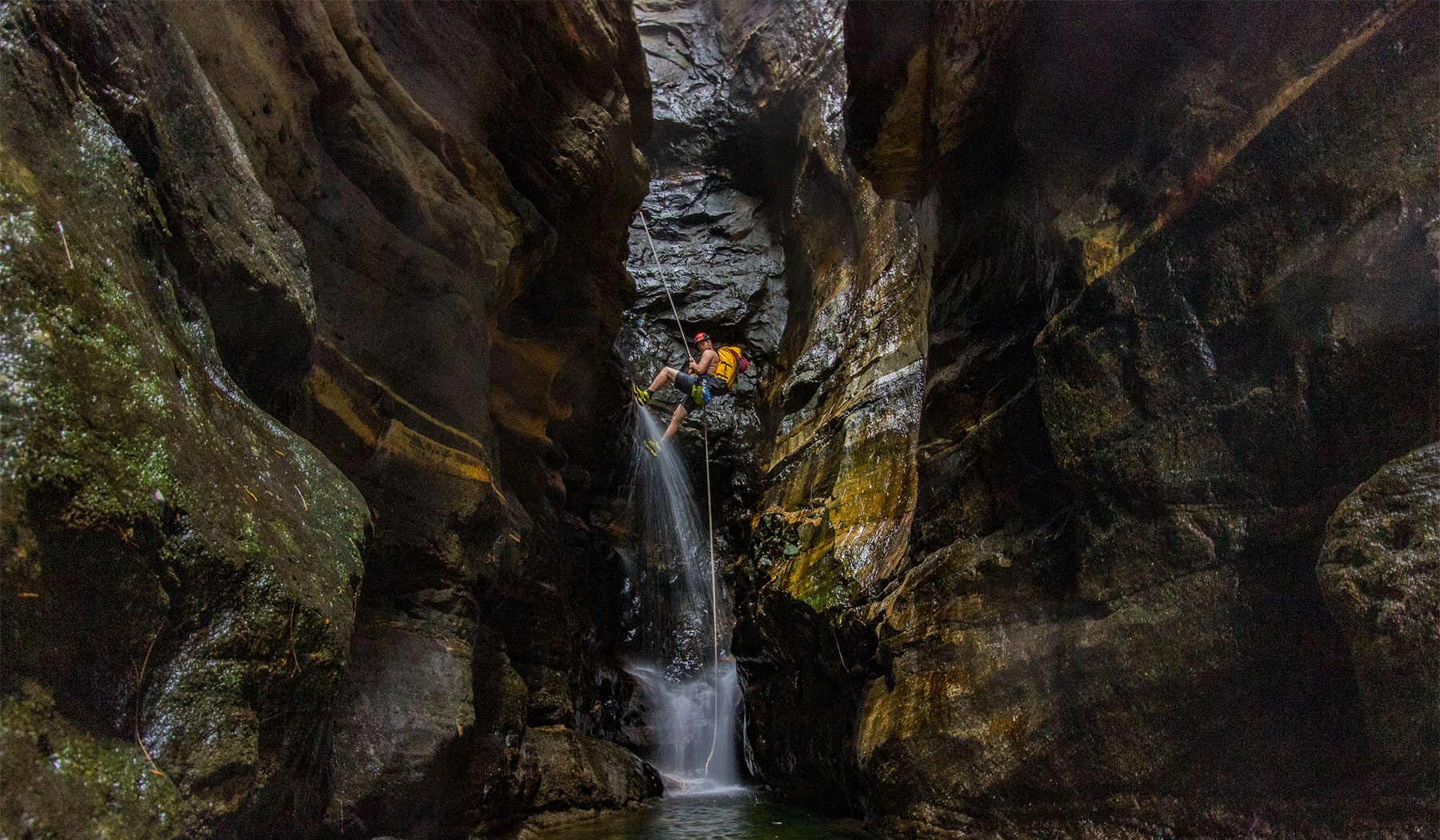 Soon the first highlight of the canyon is reached: the two main abseils which lead you down a vertical waterfall. The stance between the abseils is a chockstone, wedged in an airy position halfway down the waterfall. This is canyoning at its best! We then break for our famous lunch .
